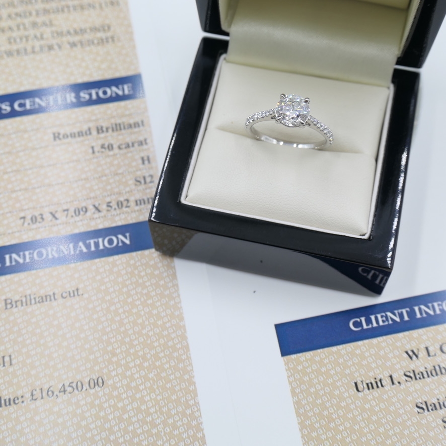 A brand-new, unused, certified platinum natural diamond solitaire engagement ring that combines sophistication, rarity, and enduring charm. At its centre rests a 1.50ct brilliant cut diamond, admired for its size and radiant sparkle. With a clarity of SI2 and a colour grade of H, the diamond exhibits lively brilliance with subtle warmth, ensuring it captivates in every light. As a natural diamond, its authenticity and rarity elevate it beyond beauty, symbolising love that will last a lifetime.