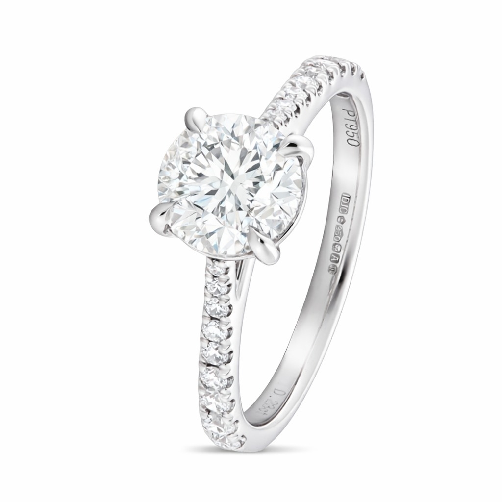 A brand-new, unused, certified natural diamond solitaire engagement ring, set with one brilliant cut diamond at the centre & a cluster of brilliant cut diamonds to the shoulders, set in platinum.