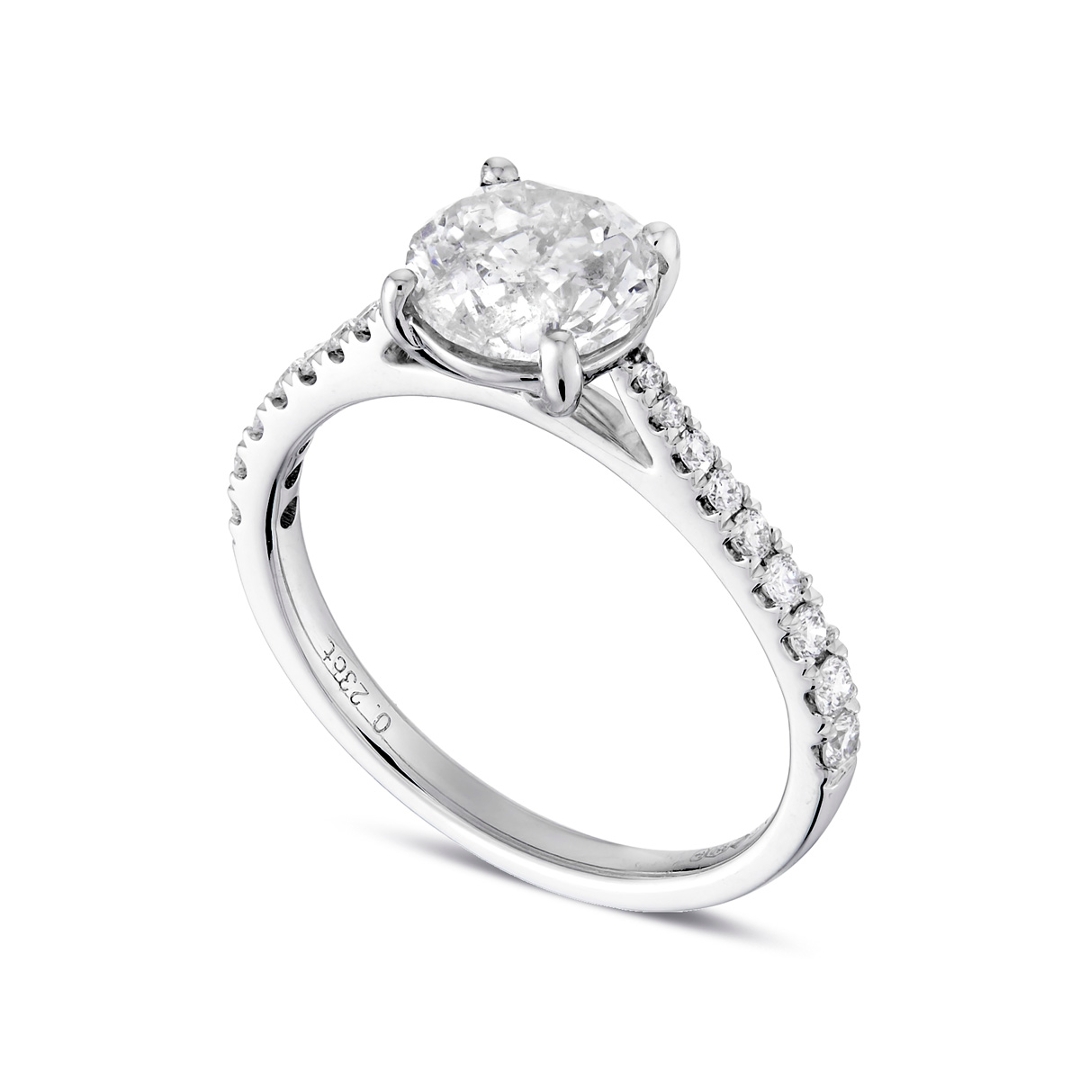 The shoulders are set with a cluster of brilliant-cut diamonds totalling 0.23ct, with SI1 clarity and G–H colour grades. These accent stones provide a subtle yet effective enhancement of sparkle, adding dimension and light across the band while maintaining a clean and well-balanced composition that keeps the focus on the centre diamond.