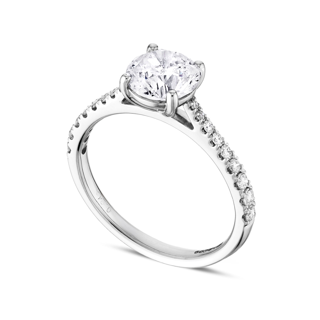 The shoulders are set with a cluster of brilliant-cut diamonds totalling 0.24ct, with SI1 clarity and G–H colour grades. These accent stones add sparkle and dimension, enhancing the ring's overall radiance while maintaining a refined, well-proportioned design that draws attention naturally to the centrepiece.