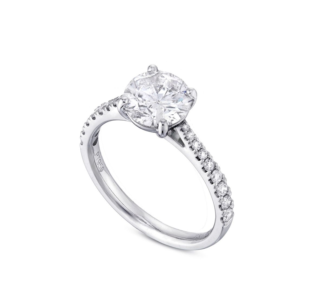 The shoulders are adorned with a refined cluster of brilliant-cut diamonds totalling 0.23ct, with clarity grades ranging from VS2 to SI1 and colour grades of G–H. These carefully set accent stones enhance the ring's overall radiance, adding subtle complexity and sparkle while maintaining a balanced, timeless design that complements the prominence of the centre diamond.