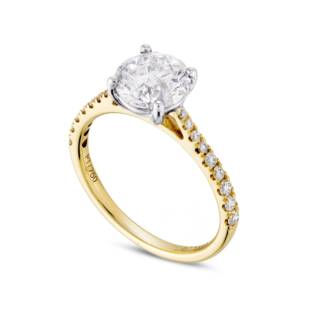 A brand-new, unused certified natural diamond solitaire engagement ring, crafted in a classic combination of platinum and 18ct yellow gold, centred with a beautiful 1.76ct brilliant-cut diamond. Graded H colour and SI2 clarity, the centre stone displays a soft warmth balanced by lively brilliance, offering a strong visual presence while retaining an elegant and timeless appeal.