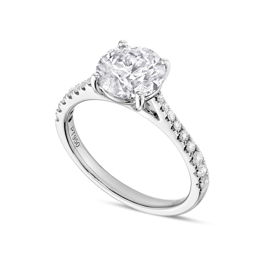 The shoulders are set with a cluster of brilliant-cut diamonds totalling 0.25ct, with SI1 clarity and G–H colour grades. These accent stones provide a seamless extension of sparkle, enhancing overall light performance while maintaining a balanced, sophisticated profile that naturally emphasises the centre diamond.