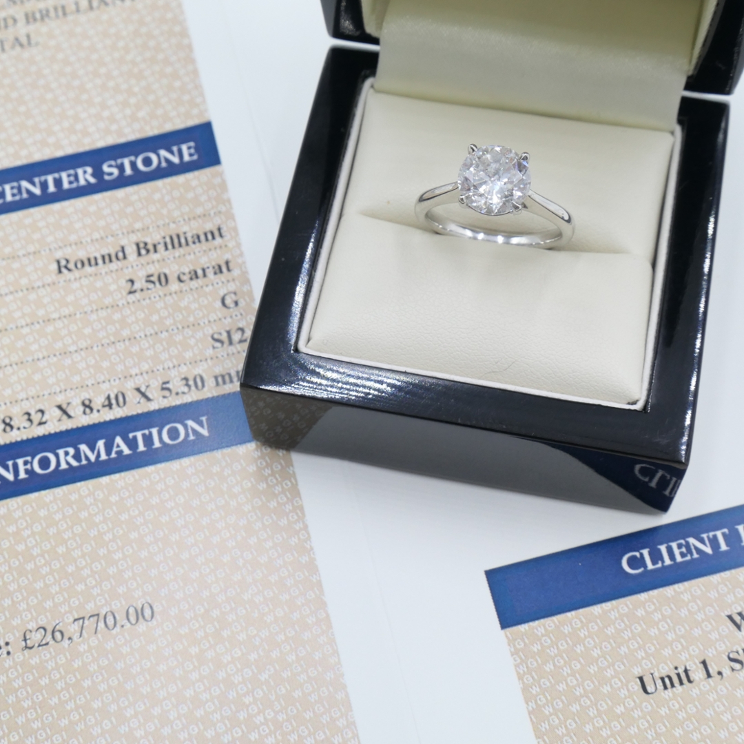 A brand-new, unused certified platinum solitaire engagement ring, created to emphasise the beauty and rarity of a natural diamond. At the centre of this elegant piece lies a brilliant-cut diamond weighing an impressive 2.50 carats, graded SI2 clarity and G colour, which delivers a commanding presence with remarkable sparkle and fire. The platinum mount enhances the stone's brightness, providing a refined backdrop that balances strength with sophistication. This combination of durability and elegance ensures the diamond remains the undeniable focal point of the design.