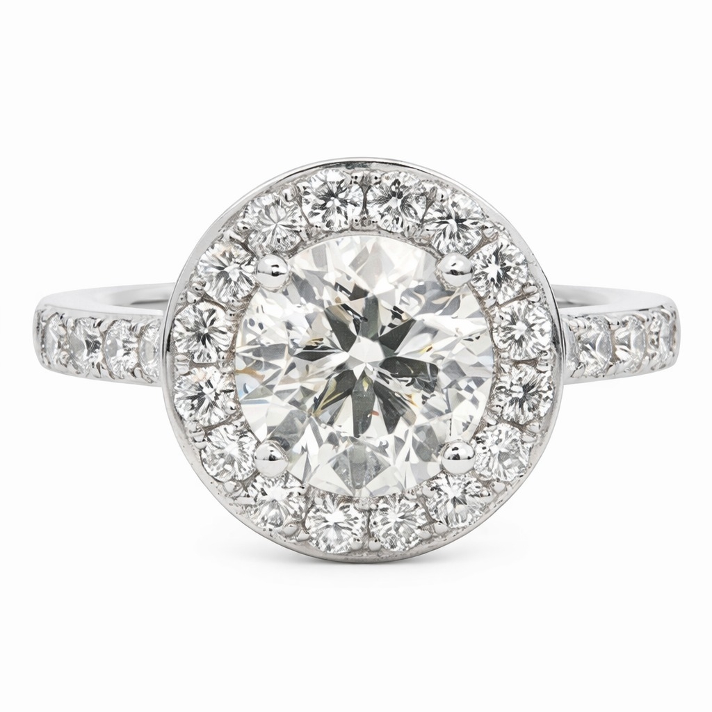 Encircling the centre is a halo of brilliant-cut natural diamonds, extending elegantly along the shoulders and adding a further 0.79ct in total. These accent stones, graded G–H colour and VS2–SI1 clarity, are carefully matched to enhance the brilliance of the centre diamond while increasing overall finger coverage. The platinum setting provides a durable and naturally white framework that complements the diamonds beautifully. With a total ring weight of 8.54g, the piece offers a substantial and reassuring feel.