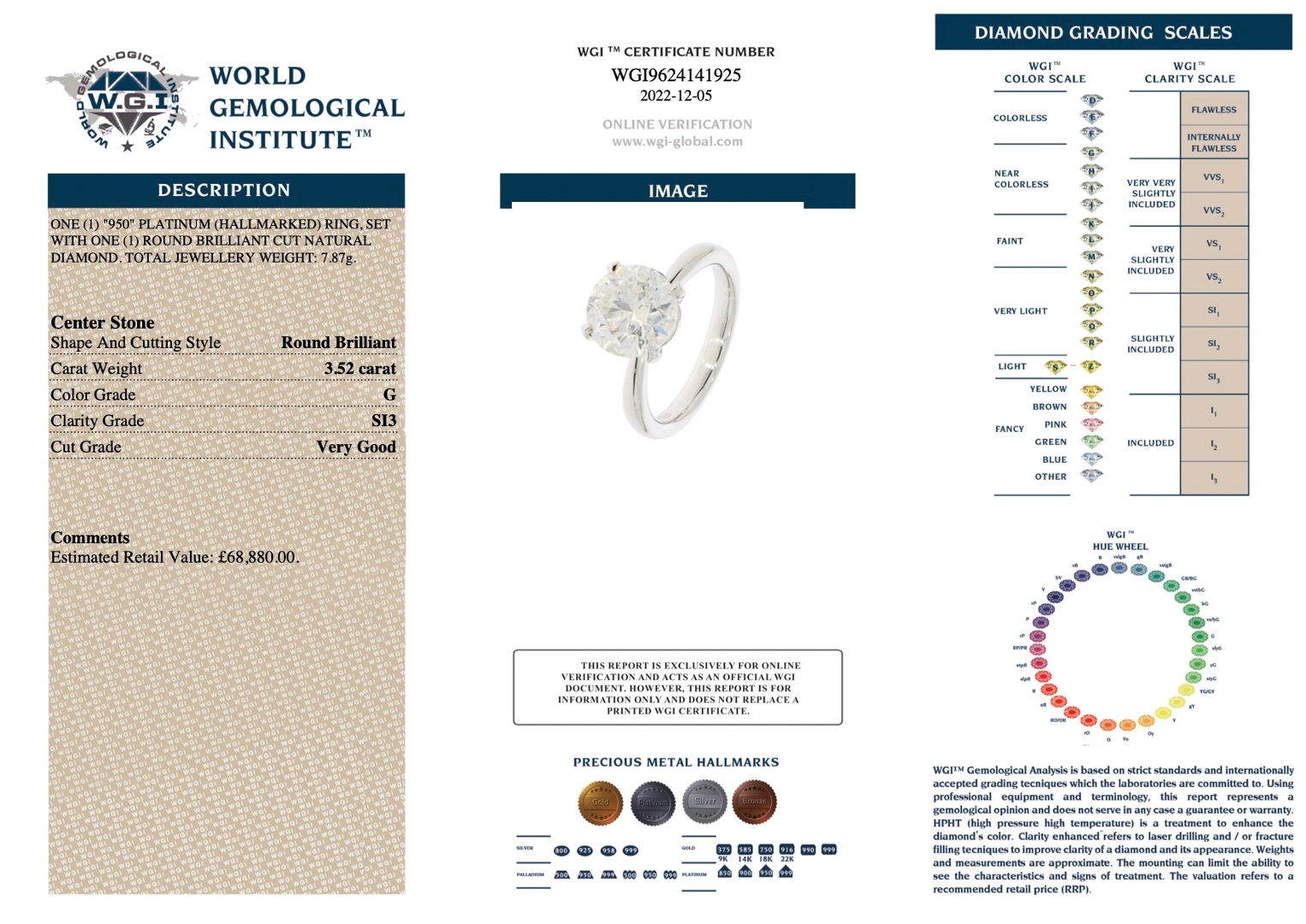 A brand-new, unused certified natural diamond solitaire engagement ring created to deliver a commanding presence and timeless appeal. At its centre sits an impressive, brilliant-cut natural diamond weighing 3.52 carats, offering exceptional scale and substantial visual impact. Graded G for colour, the diamond presents a bright, near-colourless appearance that performs beautifully in a platinum setting. With SI3 clarity, the emphasis is placed on size, fire, and overall brilliance, ensuring the diamond’s character and presence remain the focal point. This is a classic solitaire designed for those who value confidence and distinction.