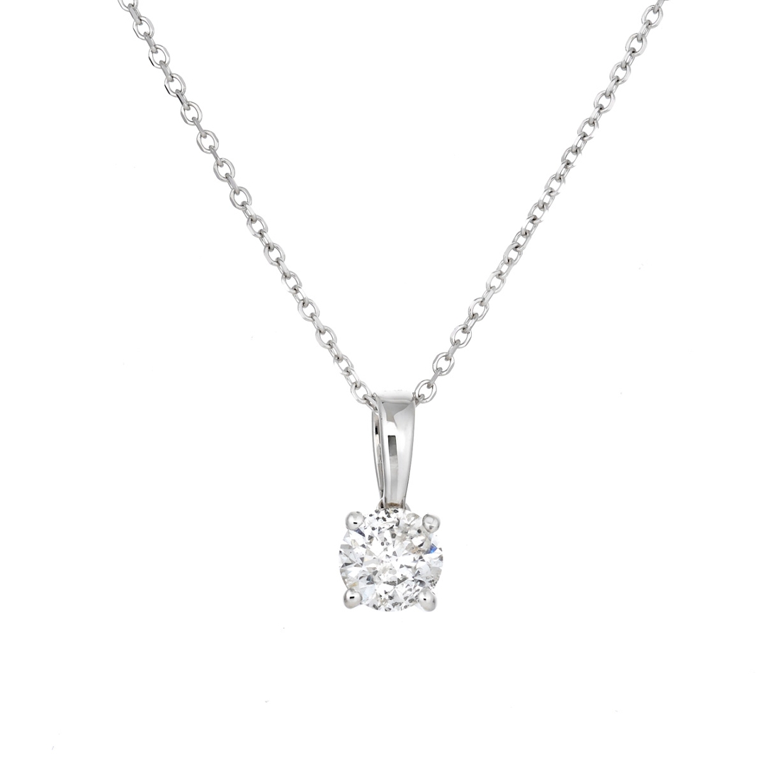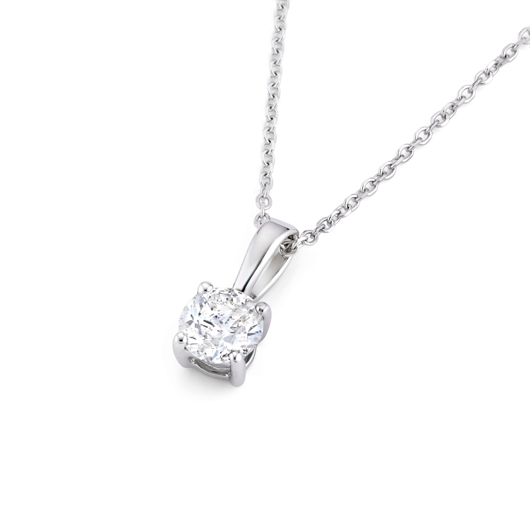 A brand-new, unused, certified natural diamond solitaire pendant, set with one brilliant cut diamond, set in 18ct white gold.