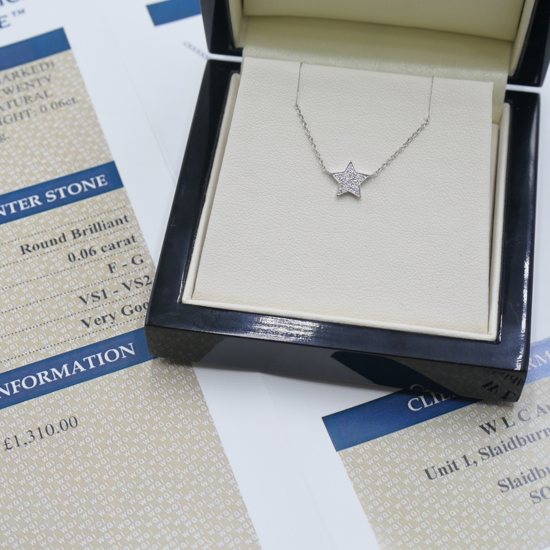 A brand-new, unused, certified 18ct white gold pendant, this stunning star-shaped design exudes elegance and charm. Adorned with brilliant-cut natural diamonds totalling 0.06ct, the pendant sparkles with a radiant brilliance that perfectly complements its celestial-inspired design. The diamonds are exceptional, with a clarity range of VS1-VS2 and an F-G colour grade, ensuring a bright, captivating sparkle.