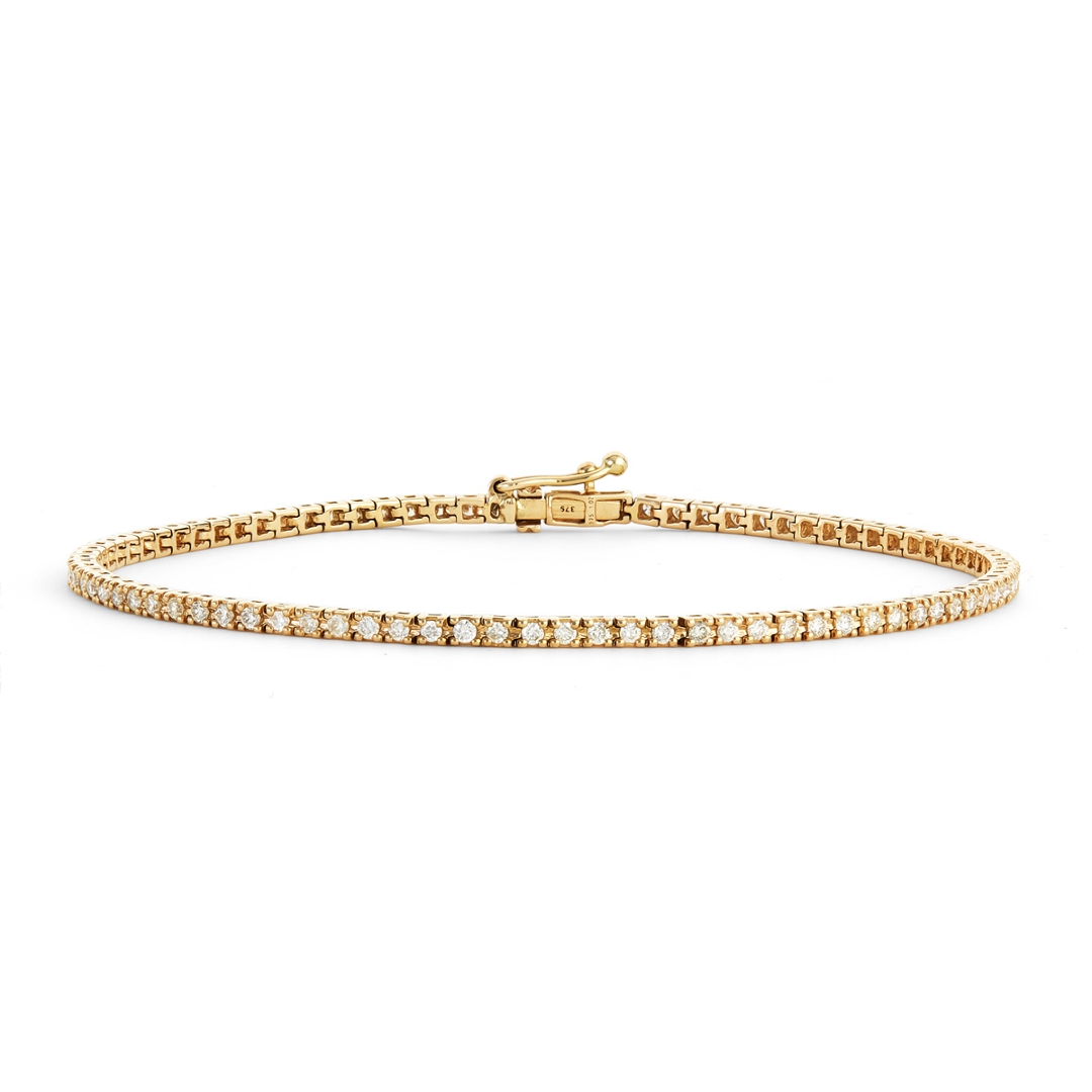 A brand-new, unused, certified natural diamond tennis bracelet, crafted in 9ct yellow gold and presented in pristine condition. The bracelet is set with a continuous cluster of brilliant-cut natural diamonds, totalling 1.02 carats, graded G–H in colour and SI1 clarity, offering bright, even sparkle along the wrist. The warm tone of yellow gold provides classic contrast, enhancing the diamonds while maintaining a timeless, versatile aesthetic. With a total weight of 4.45 grams and a bracelet length of 18cm, the piece sits comfortably and securely, suitable for both everyday wear and more formal occasions.