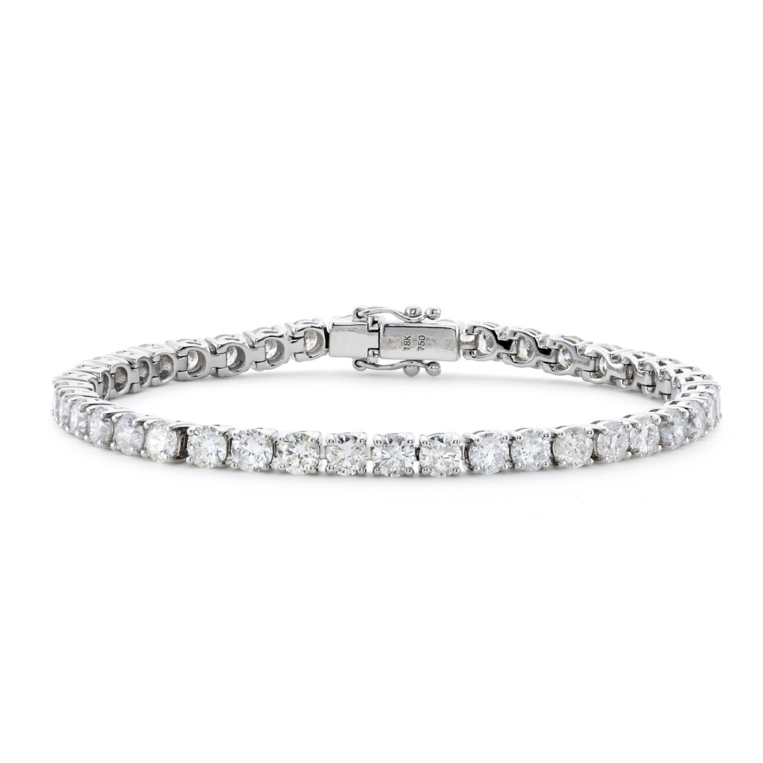 A brand-new, unused certified natural diamond tennis bracelet that radiates luxury, brilliance and timeless sophistication. This exceptional piece is set with a continuous line of brilliant-cut natural diamonds, totalling an impressive 10.40ct. Each diamond is meticulously matched for brilliance, symmetry and fire, graded G–H in colour and SI1–SI2 in clarity, creating a breathtaking display of sparkle from every angle. Expertly crafted in 18ct white gold, the bracelet’s cool, lustrous finish perfectly complements the diamonds’ radiant whiteness, offering a refined and elegant aesthetic. Measuring 18cm in length and weighing 18.60 grams, it combines exceptional craftsmanship with lasting comfort and strength. With a professional valuation of £30,740, this bracelet stands as a remarkable expression of prestige and enduring beauty.