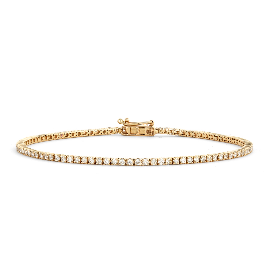 A brand-new, unused, certified natural diamond tennis bracelet, crafted in 9ct yellow gold and presented in pristine condition. The bracelet is set with a continuous cluster of brilliant-cut natural diamonds, totalling 1.51 carats, graded G–H in colour and SI1 clarity. The diamonds are carefully matched to create an even, uninterrupted line of sparkle, while the warm tone of yellow gold provides classic contrast and timeless appeal. With a total weight of 4.29 grams and a bracelet length of 17.80cm, the piece offers a secure, comfortable fit and a refined profile suitable for both daily wear and formal settings.
