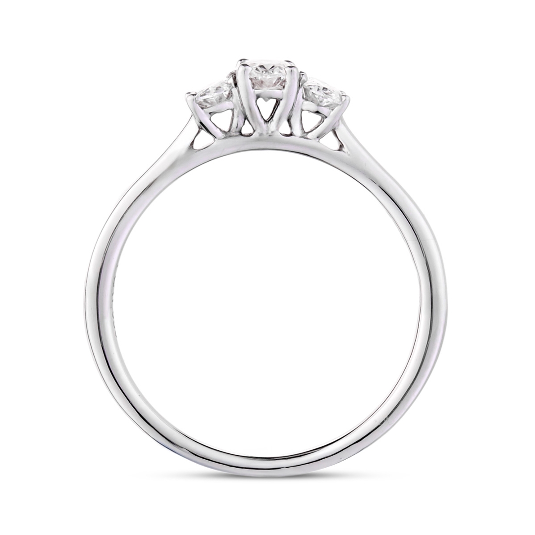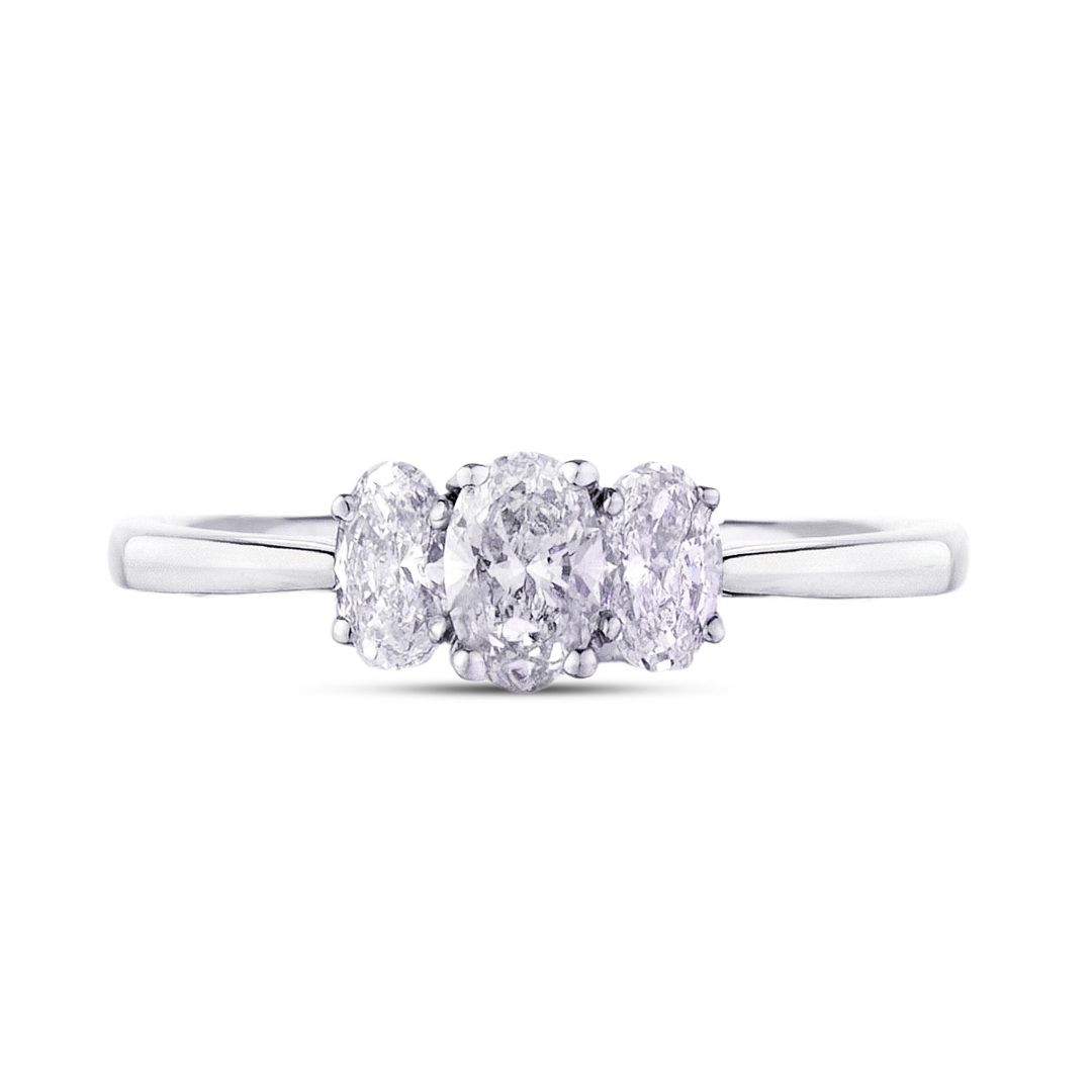 A brand-new, unused, certified natural diamond three-stone cluster ring, this elegant piece showcases timeless beauty and refined craftsmanship. Expertly crafted in platinum, it features three exquisite oval-cut natural diamonds, together weighing 0.70 carats. Each diamond, graded F–G in colour and SI2 in clarity, radiates a captivating brilliance and purity, capturing light with exceptional fire and sparkle. The trio of diamonds symbolises the past, present, and future — a meaningful design that celebrates everlasting love and devotion.