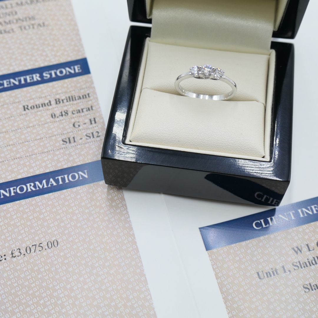 The total diamond weight is 0.48ct, and each diamond was carefully selected for its clarity and natural brilliance. Graded SI1-SI2 for clarity and G-H for colour, the diamonds offer remarkable fire, ensuring the ring dazzles with incredible brilliance. The combination of the brilliant-cut diamonds creates a radiant, timeless, and sophisticated effect.