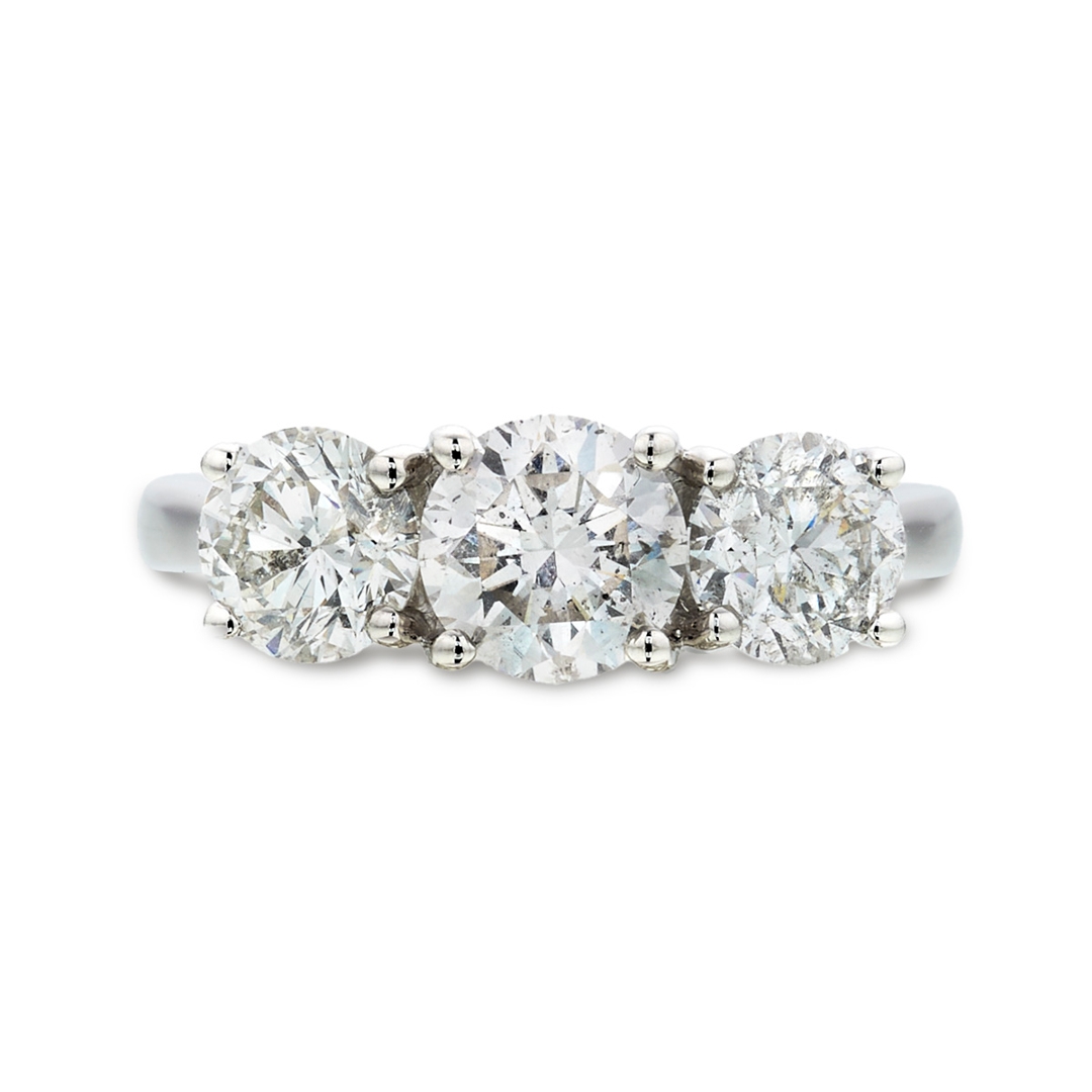 A brand new, unused certified natural diamond three-stone eternity ring that radiates timeless sophistication, brilliance and symbolic beauty. This exquisite piece showcases three magnificent, brilliant-cut natural diamonds, totalling 2.43ct, each meticulously chosen for its exceptional sparkle and fire. The diamonds are graded F–G in colour and SI1–SI2 in clarity, displaying an extraordinary balance of purity and radiance. Expertly set in luxurious platinum, the setting enhances the natural brilliance of each stone while providing strength, durability and a refined aesthetic. With a professional valuation of £9,100, this ring is a true reflection of fine craftsmanship, elegance and enduring value. Weighing 6.14 in grams.