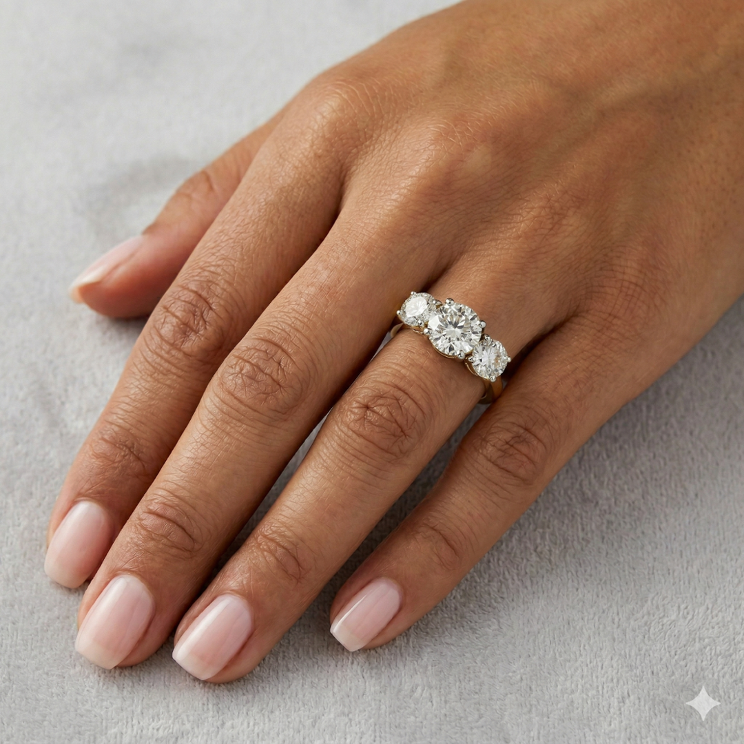 A brand-new, unused certified natural diamond three-stone eternity ring, set with three exceptional brilliant-cut diamonds totalling an impressive 3.14ct, crafted in a refined combination of 18ct yellow and white gold. The classic three-stone design symbolises past, present and future, while offering a bold and substantial presence across the finger, enhanced by the contrast between warm yellow gold and bright white gold, creating a distinctive and contemporary finish.