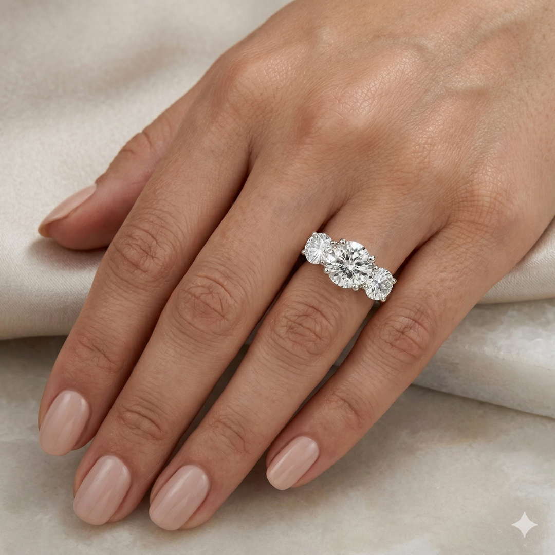 A brand-new, unused certified natural diamond three-stone ring, set with three exceptional brilliant-cut diamonds totalling an impressive 3.28ct, elegantly mounted in platinum. The classic three-stone design offers a powerful and balanced presence across the finger, symbolising past, present and future, while allowing each diamond to stand out with equal prominence and refined proportion within a timeless setting.