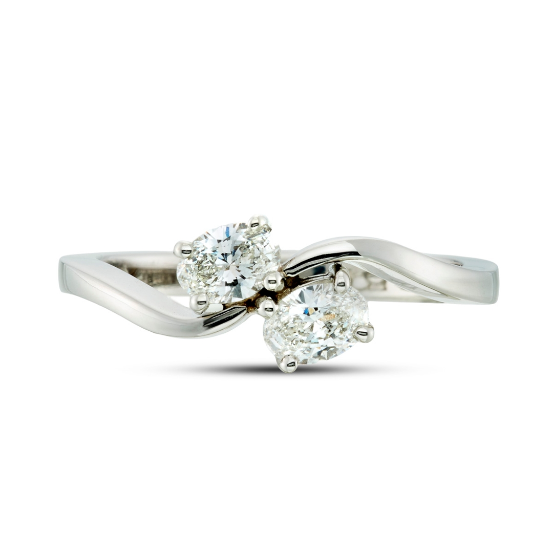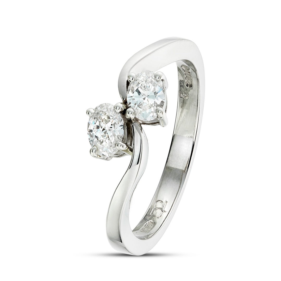 A brand-new, unused, certified natural diamond two-stone cluster ring, with two oval-cut diamonds, set in platinum.
