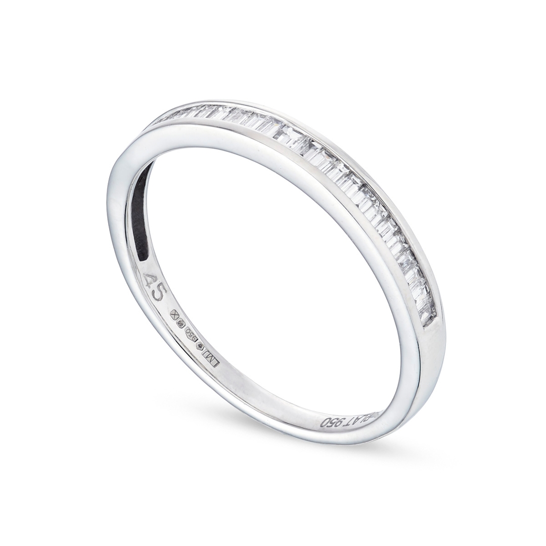 A brand-new, unused certified natural diamond wedding ring, designed with a refined cluster of baguette-cut diamonds totalling 0.33ct, all set within a sleek platinum mount. The diamonds display a bright G–H colour and clarity ranging from VS2 to SI1, creating a clean and balanced visual effect. The baguette cut offers crisp, linear reflections rather than traditional sparkle, and the clustered formation brings a subtle yet distinctive presence, ideal for those who appreciate understated elegance with a modern edge.