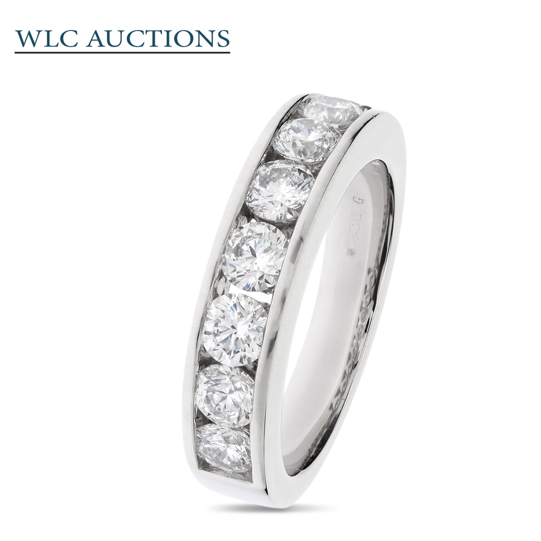 A brand-new, unused certified natural diamond wedding ring, expertly crafted in platinum and set with eight brilliant-cut diamonds totalling an impressive 1.48ct. Each diamond has been thoughtfully selected for its lively sparkle, with clarity ranging from VS2 to SI1 and a bright G–H colour grade, ensuring a crisp, near-colourless appearance. The stones are evenly arranged to create a continuous line of light across the band, offering a refined yet eye-catching presence suited to both everyday wear and special occasions.