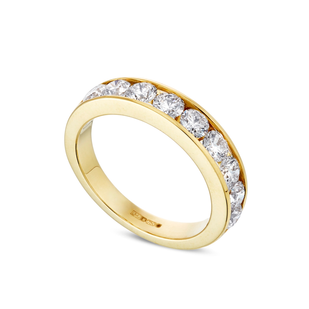 A brand-new, unused certified natural diamond wedding ring, set with nine brilliant-cut diamonds totalling 1.67ct, all beautifully mounted in 18ct yellow gold. The diamonds are well matched, exhibiting a bright G–H colour and clarity ranging from VS2 to SI1, producing a lively and consistent sparkle. The warm tone of the yellow gold contrasts elegantly with the brilliance of the stones, while the evenly spaced arrangement creates a continuous line of light that offers both presence and timeless appeal on the hand.