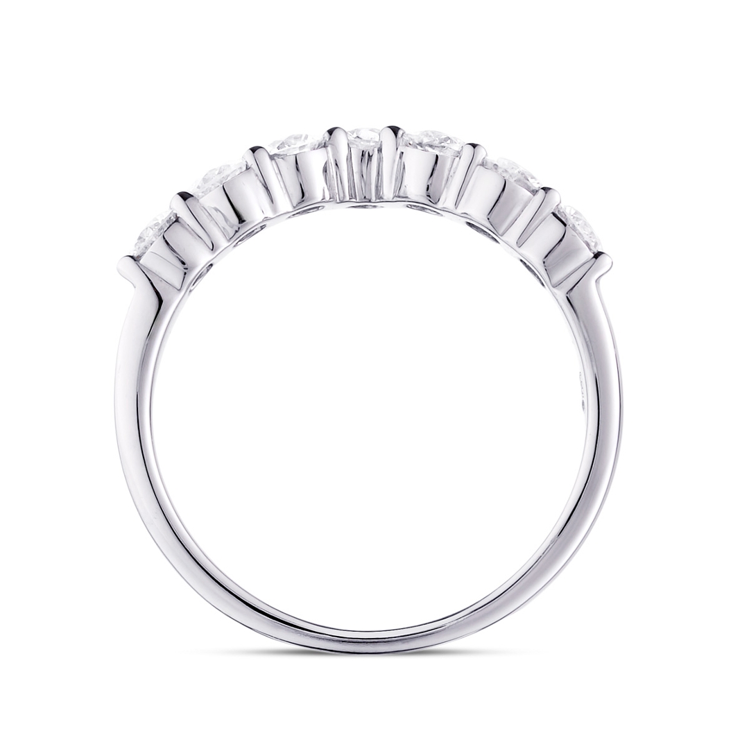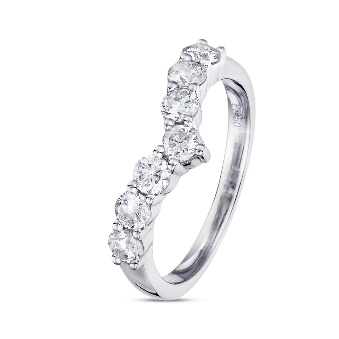 A brand-new, unused, certified natural diamond wishbone eternity ring set with seven brilliant cut diamonds, set in platinum.