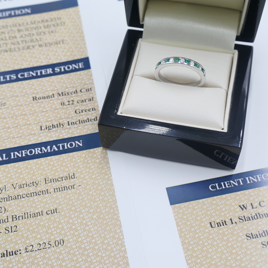 A brand-new, unused eternity ring crafted in platinum, this certified piece exudes refined beauty and enduring elegance. Set with seven round mixed-cut natural emeralds and six brilliant-cut natural diamonds, it captures both vivid colour and radiant sparkle in perfect harmony. The emeralds, weighing 0.22ct, display a rich green tone that enhances the cool sophistication of the platinum setting. At the same time, the diamonds, totalling 0.18ct, are graded G–H in colour with SI1–SI2 clarity, offering lively brilliance that enhances their natural charm.