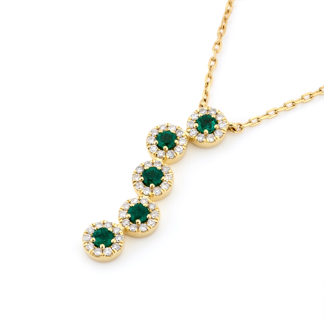 A brand-new, unused, certified natural diamond & emerald gemstone droplet cluster pendant, set with six round mixed-cut emerald gemstones at the centre & a cluster of brilliant-cut diamonds in a halo setting, set in 18ct yellow gold.