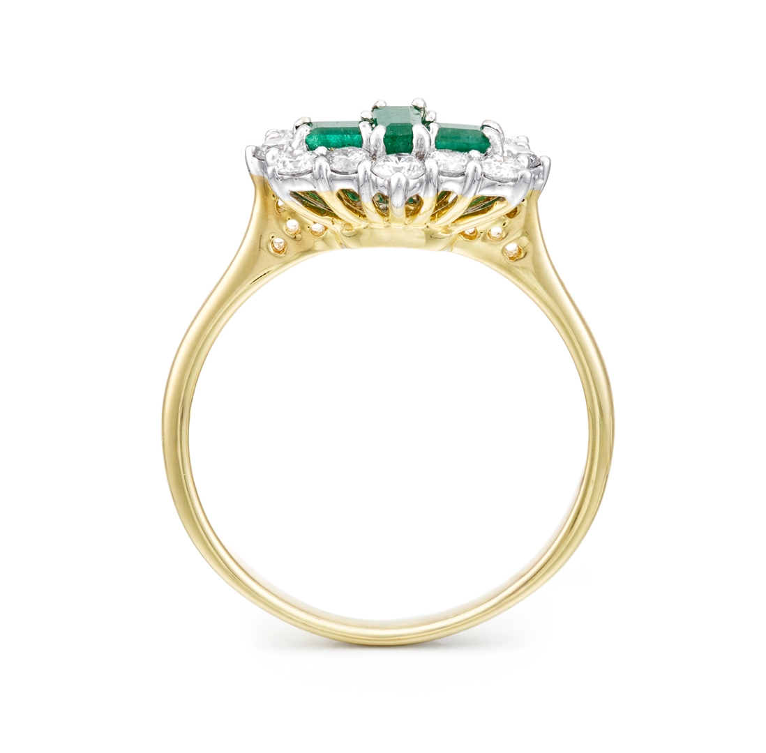 A brand-new, unused, certified natural diamond & emerald boat-shaped cluster ring, with three octagonal step-cut emerald gemstones at the centre & twelve brilliant-cut diamonds in a halo setting, set in 18ct yellow & white gold.