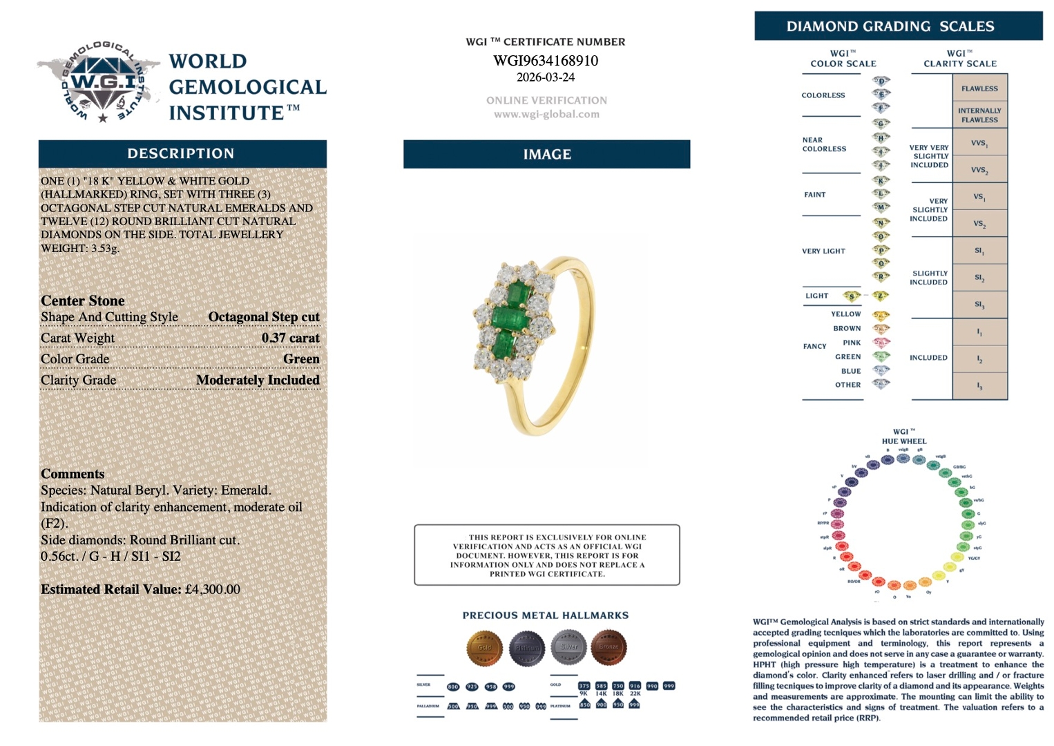 The diamonds total approximately 0.56ct and are graded G–H in colour with SI1–SI2 clarity, delivering a bright and lively sparkle that complements both the emeralds and the two-tone gold setting. Natural diamonds remain highly valued for their rarity and consistent global demand, making them a desirable choice for collectors seeking both enduring beauty and long-term appreciation potential within fine jewellery.