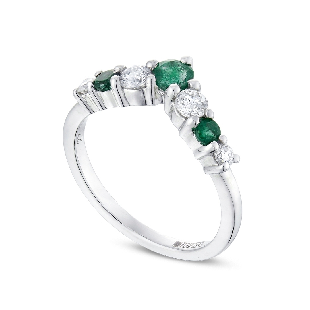 A brand-new, unused, certified natural diamond and emerald gemstone wishbone eternity ring, crafted in platinum and designed with a graceful curved silhouette that sits elegantly against the finger. The piece is set with three round mixed-cut emerald gemstones, totalling approximately 0.42 ct, each displaying a vibrant green hue that adds natural depth and character. Complementing these are four brilliant-cut natural diamonds, carefully arranged to enhance the flowing wishbone design and create a balanced interplay of colour and sparkle.