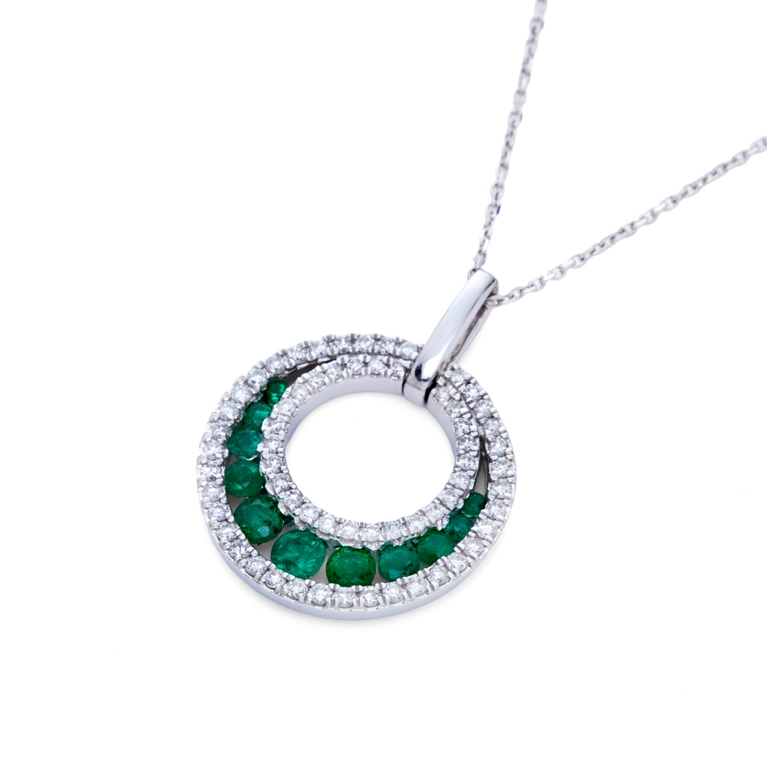A brand-new, unused, certified natural diamond & emerald circle-shaped cluster pendant, with a cluster of round mixed-cut emerald gemstones at the centre & a cluster of brilliant-cut diamonds in a halo setting, in 9ct white gold.