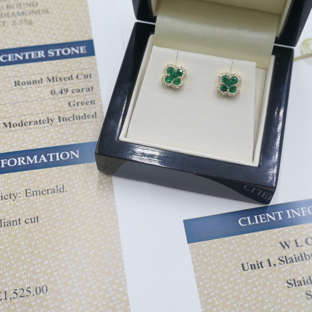 - > Natural Emerald 0.49ct & Diamond 0.18ct Clover Shaped Cluster Earrings