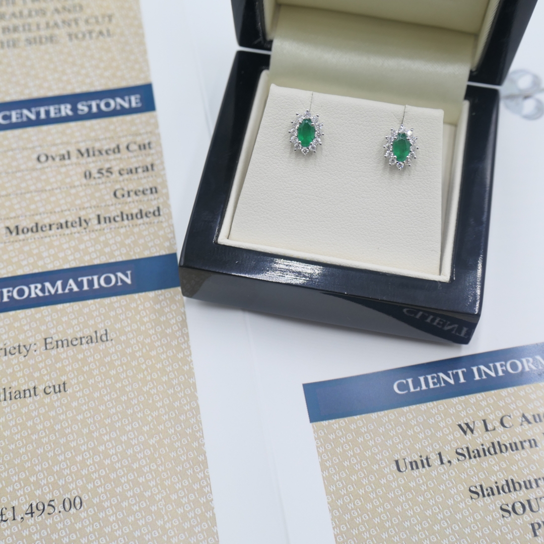A brand new, unused, certified 18ct white gold pair of natural diamond & emerald gemstone cluster earrings, set with two oval mixed cut emerald gemstones to the centre & a cluster of brilliant cut diamonds in a halo setting.