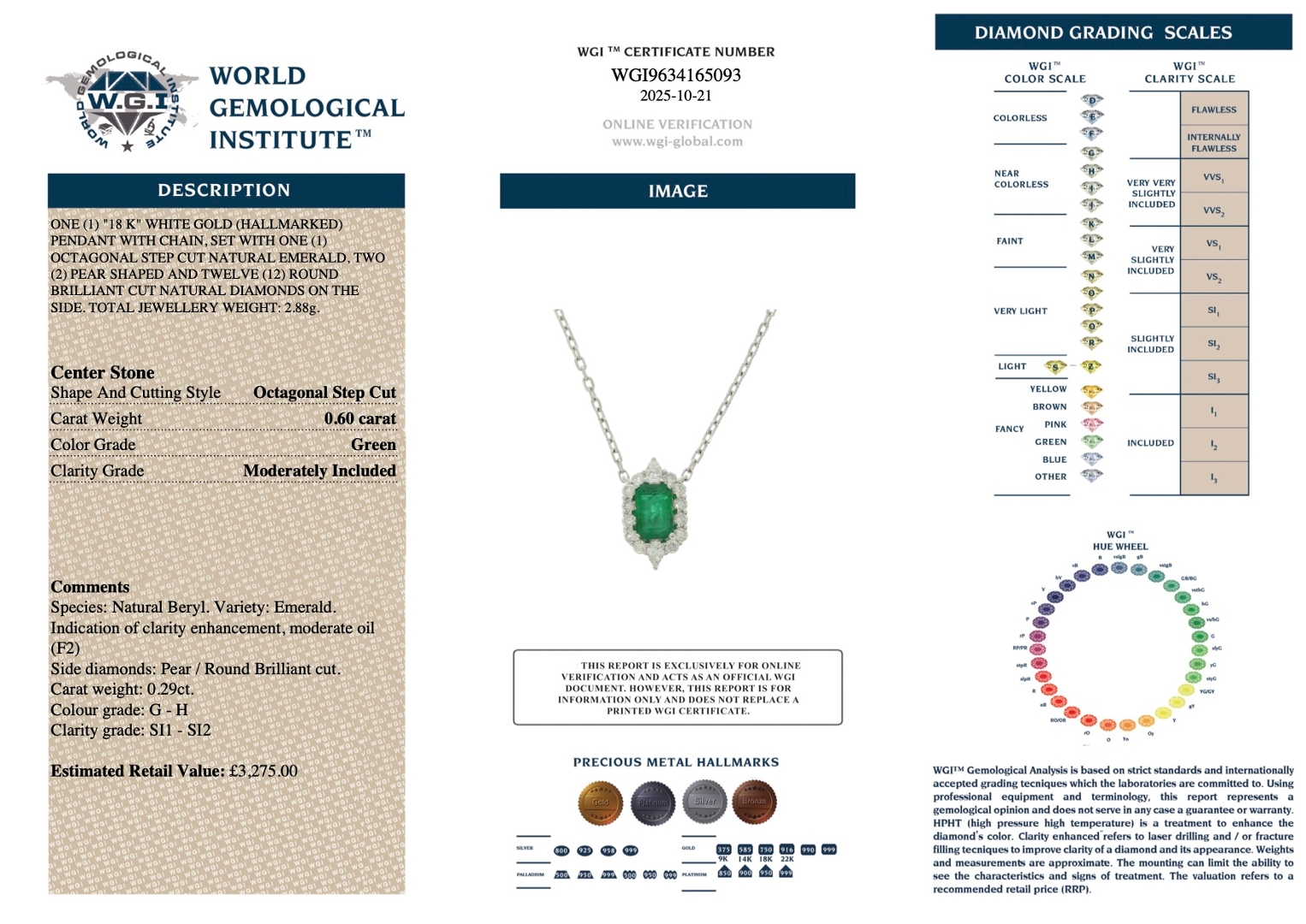 A brand-new, unused, certified natural diamond and emerald gemstone cluster pendant, this elegant piece embodies sophistication, luxury, and timeless beauty. Exquisitely crafted in 18ct white gold, it features a striking octagonal step-cut emerald gemstone at its centre, weighing 0.60 carats. The emerald’s rich green hue exudes depth and vibrancy, capturing the eye with its natural allure. Surrounding the centre stone is a delicate halo of brilliant-cut natural diamonds, totalling 0.29 carats, graded G–H in colour and SI1–SI2 in clarity. The diamonds’ radiant sparkle enhances the emerald’s vivid tone, creating a stunning contrast of colour and light.