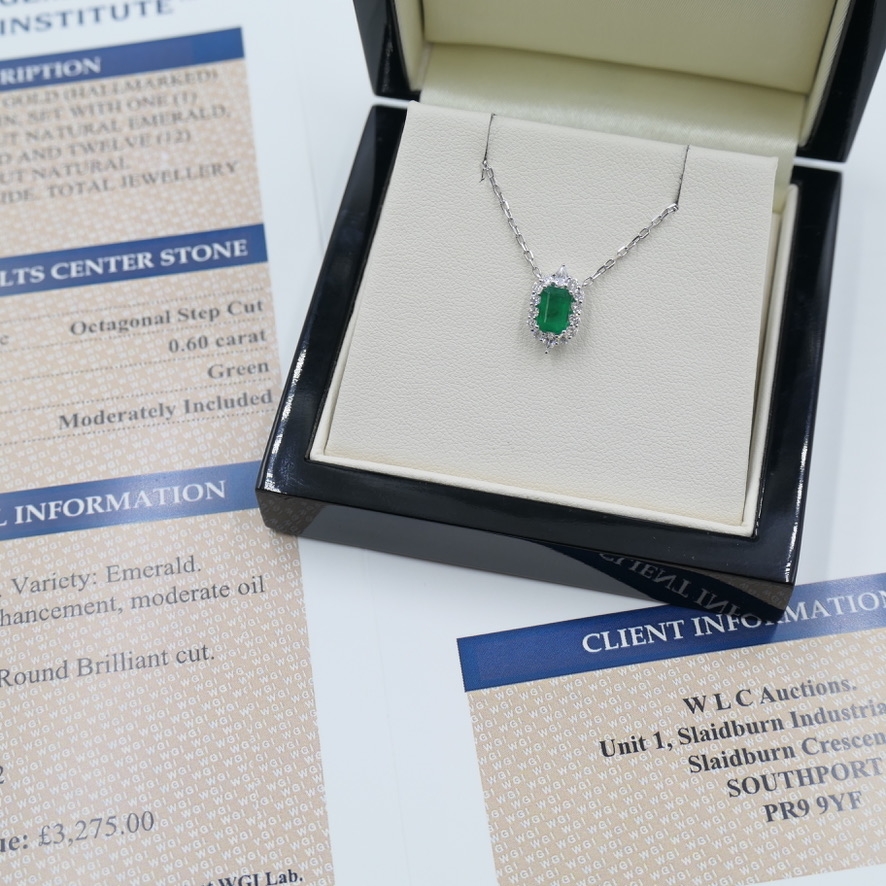 A brand-new, unused, certified natural diamond & emerald gemstone cluster pendant, with one octagonal step-cut emerald gemstone at the centre & a cluster of brilliant-cut diamonds in a halo setting, set in 18ct white gold.