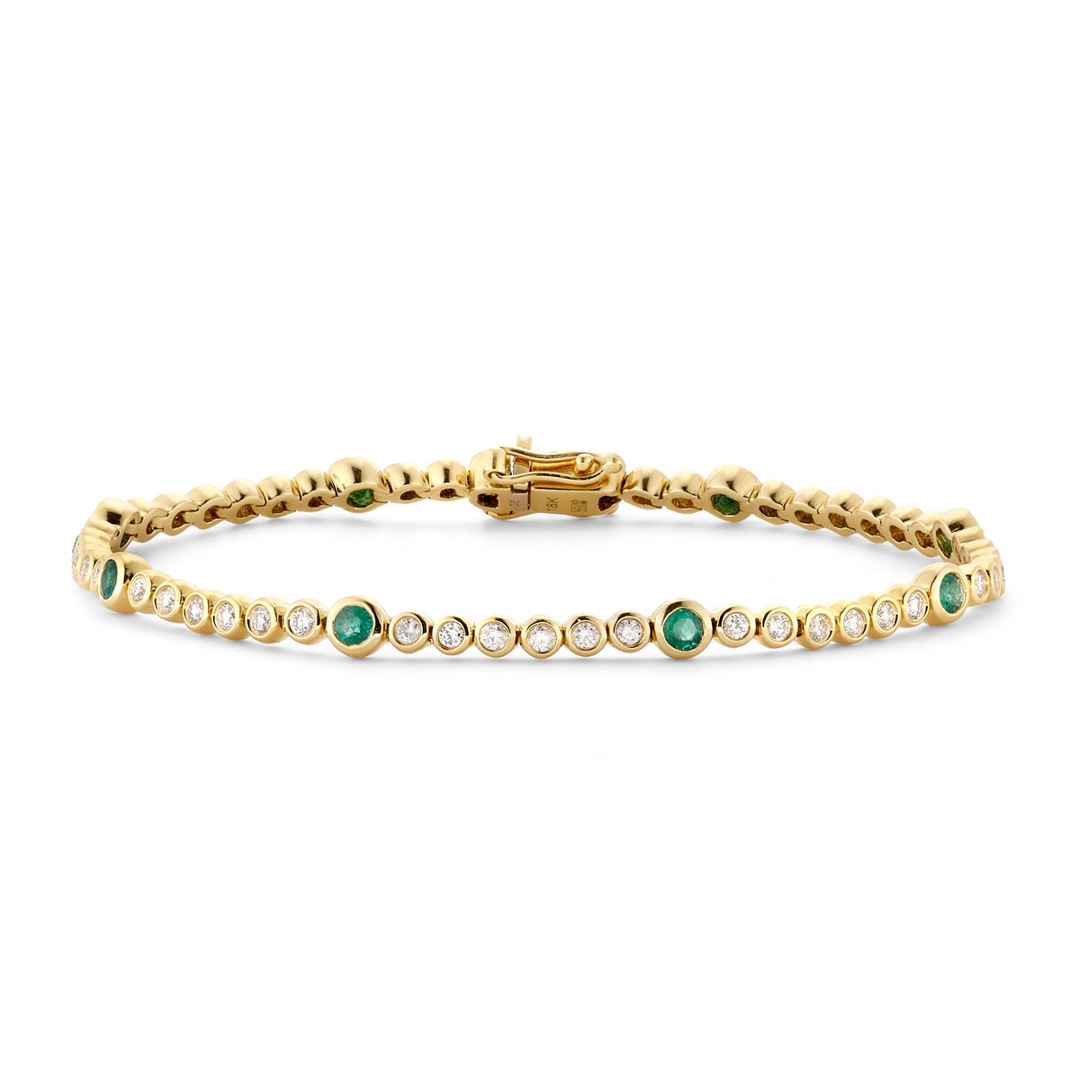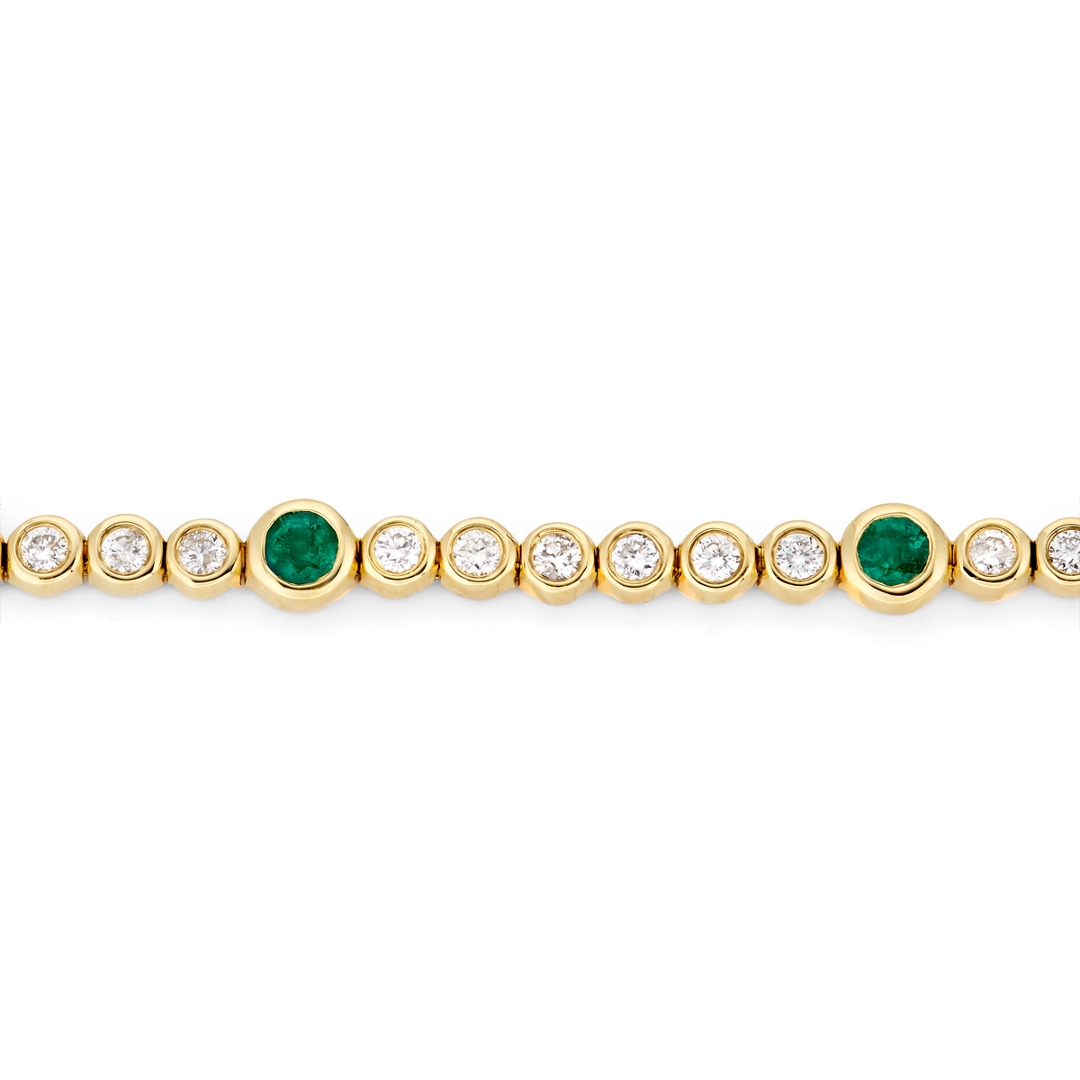 A brand-new, unused, certified natural diamond & emerald line bracelet, set with eight round cut emerald gemstones & a cluster of brilliant-cut diamonds, set in 18ct yellow gold.