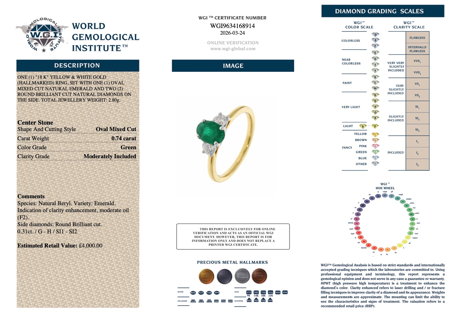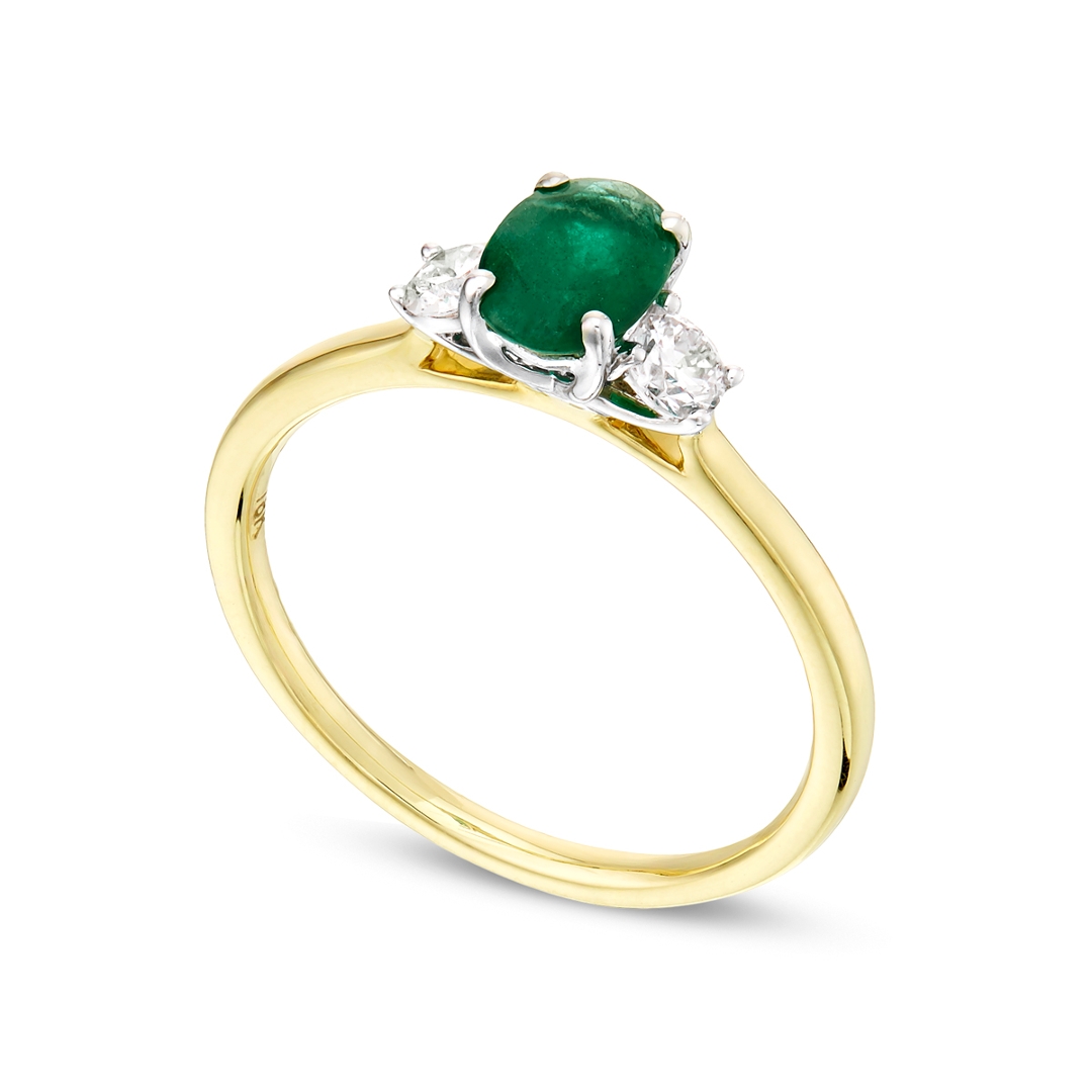 A brand-new, unused certified natural diamond and emerald three-stone cluster ring, crafted in an elegant combination of 18ct yellow and white gold, offering a timeless design with a refined two-tone finish. At the centre sits an oval mixed-cut emerald weighing approximately 0.74ct, displaying a rich green hue with natural vibrancy and depth. Positioned to either side are two brilliant-cut natural diamonds, forming a classic three-stone arrangement that enhances the presence of the central gemstone while maintaining a balanced and sophisticated profile.