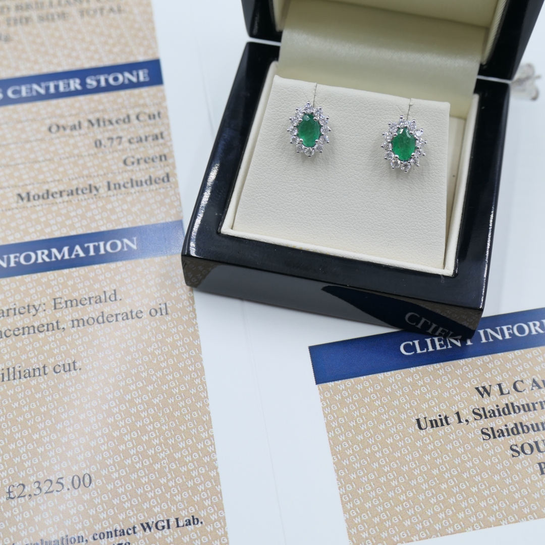 A brand-new, unused certified pair of natural diamond and emerald gemstone cluster earrings, beautifully crafted in 18ct white gold. Each earring features a vibrant oval mixed-cut emerald, together weighing 0.77 carats, showcasing a rich green hue that embodies timeless elegance and sophistication. Surrounding the emeralds is a sparkling cluster of brilliant-cut natural diamonds, totalling 0.46 carats, with G-H colour and SI1–SI2 clarity, providing a refined brilliance that perfectly complements the vivid tones of the emeralds. The sleek white gold setting enhances the diamonds' incredible luminosity while accentuating the deep, natural beauty of the emeralds.