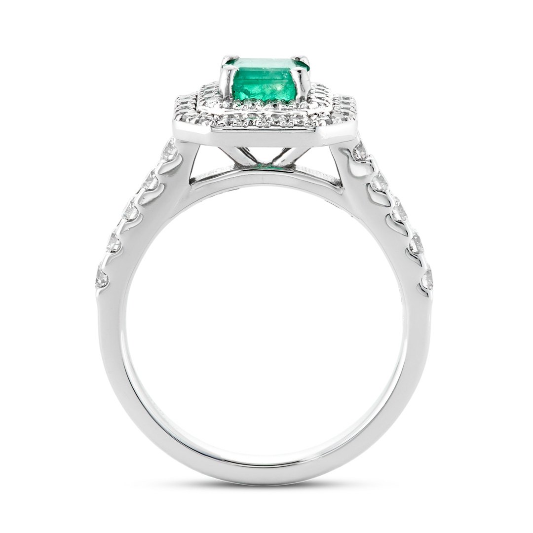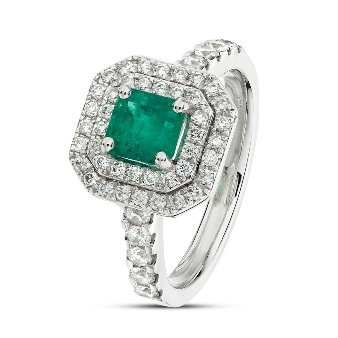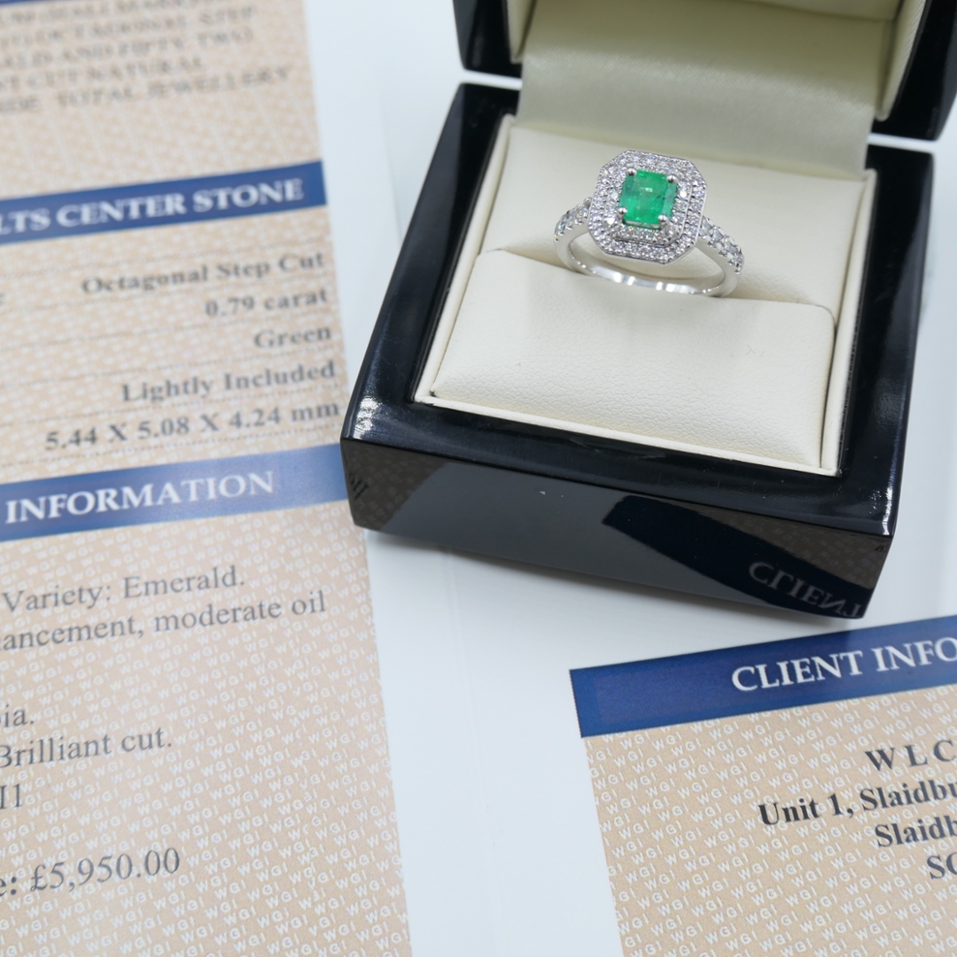 A brand-new, unused certified natural diamond and emerald cluster ring displaying a captivating balance of colour, brilliance, and refinement. At its centre sits a 0.79-carat octagonal step-cut emerald of vivid green hue, radiating natural charm and vibrant depth. Surrounding the emerald is a dazzling double halo of brilliant-cut diamonds, extending gracefully along the shoulders to create an exceptional display of sparkle and sophistication. With a total diamond weight of 0.64 carats, graded F–G in colour and VS2–SI1 in clarity, the diamonds beautifully complement the emerald’s rich tone, adding striking contrast and luminosity.