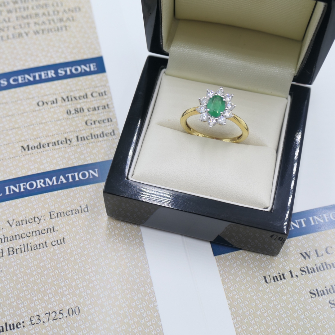 A brand-new, unused certified 18ct yellow and white gold cluster ring, this beautiful piece is set with a captivating combination of natural emerald and diamond gemstones. Weighing 3.68 grams. At the centre, an oval mixed-cut emerald, weighing 0.80ct, catches the eye with its vibrant green colour, radiating both elegance and charm. Surrounding the emerald is a halo of brilliant-cut diamonds, totalling 0.70ct, which add a brilliant sparkle and elevate the overall design with their dazzling light.