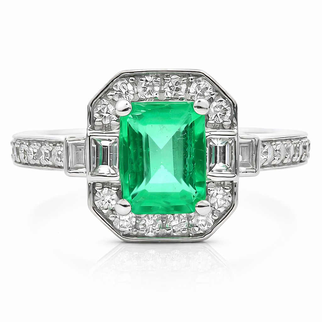 A brand-new, unused, certified natural diamond and emerald Asscher-shaped cluster ring, expertly set in platinum and defined by clean geometry and refined symmetry. At the centre sits an emerald weighing 1.10 carats, selected for its vibrant green tone and crisp step-cut facets that draw the eye inward. Four baguette-cut natural diamonds frame the centre stone, reinforcing the architectural Asscher outline and adding sharp brilliance through linear contrast. Surrounding this, a halo of brilliant-cut diamonds and further diamonds along the shoulders create a measured lift in sparkle without overwhelming the emerald. The total diamond weight of 0.46 carats has been carefully balanced to enhance clarity, proportion and wearability.