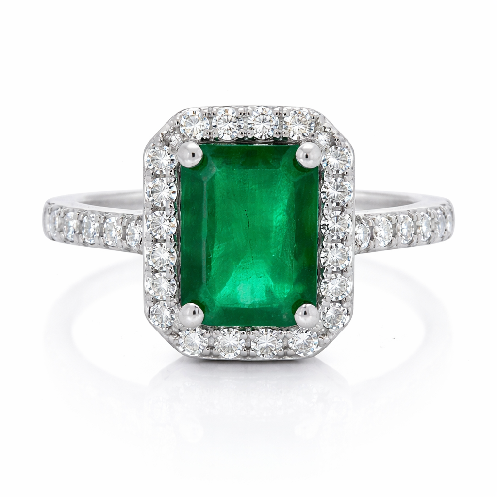 - > Natural Emerald 1.25ct & Diamond 0.38ct Asscher Shaped Cluster Ring