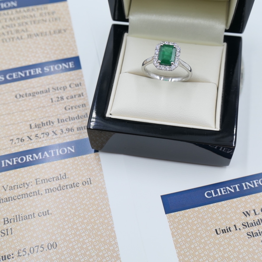 A brand-new, unused, certified natural diamond and emerald cluster ring of exceptional elegance and craftsmanship. At its heart lies a mesmerising 1.28-carat octagonal step-cut emerald in vibrant green, exuding timeless sophistication and natural beauty. Surrounding the central gemstone is a delicate halo of brilliant-cut diamonds, totalling 0.29 carats, which shimmer with exceptional fire and clarity. Graded between VS2 and SI1 with F–G colour, these diamonds perfectly enhance the emerald’s rich hue, creating a stunning contrast of light and depth.