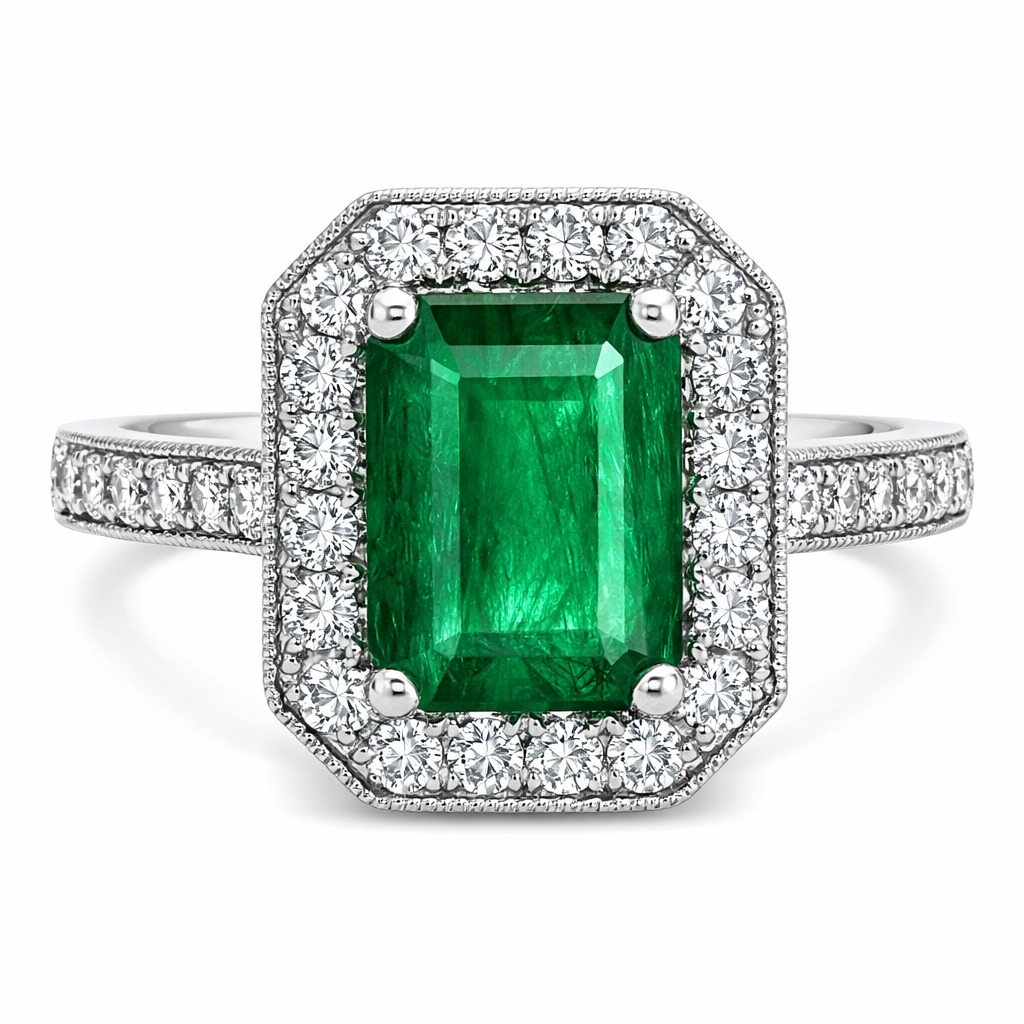 - > Natural Emerald 1.57ct & Diamond 0.40ct Asscher Shaped Cluster Ring