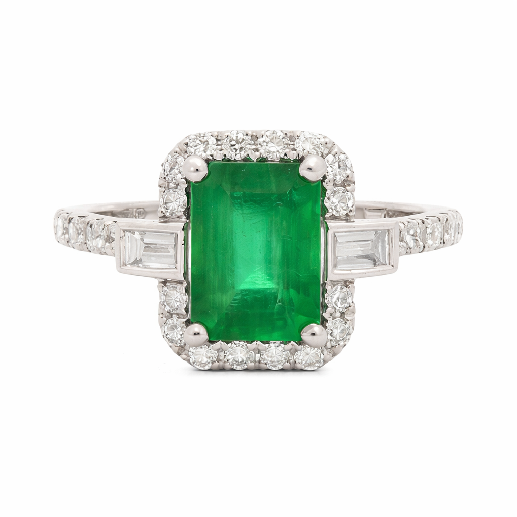 A brand-new, unused certified natural diamond and emerald emerald-shaped cluster ring crafted in platinum, offering a refined balance of colour, structure and lasting quality. At the centre sits an emerald weighing 1.67 carats, chosen for its rich green hue and crisp step-cut definition. Surrounding the centre stone is a halo of brilliant-cut natural diamonds, designed to enhance light performance while drawing focus to the emerald. Baguette-cut diamonds flank either side, introducing elegant symmetry, while additional brilliant-cut diamonds extend along the shoulders to complete the composition with controlled brilliance.