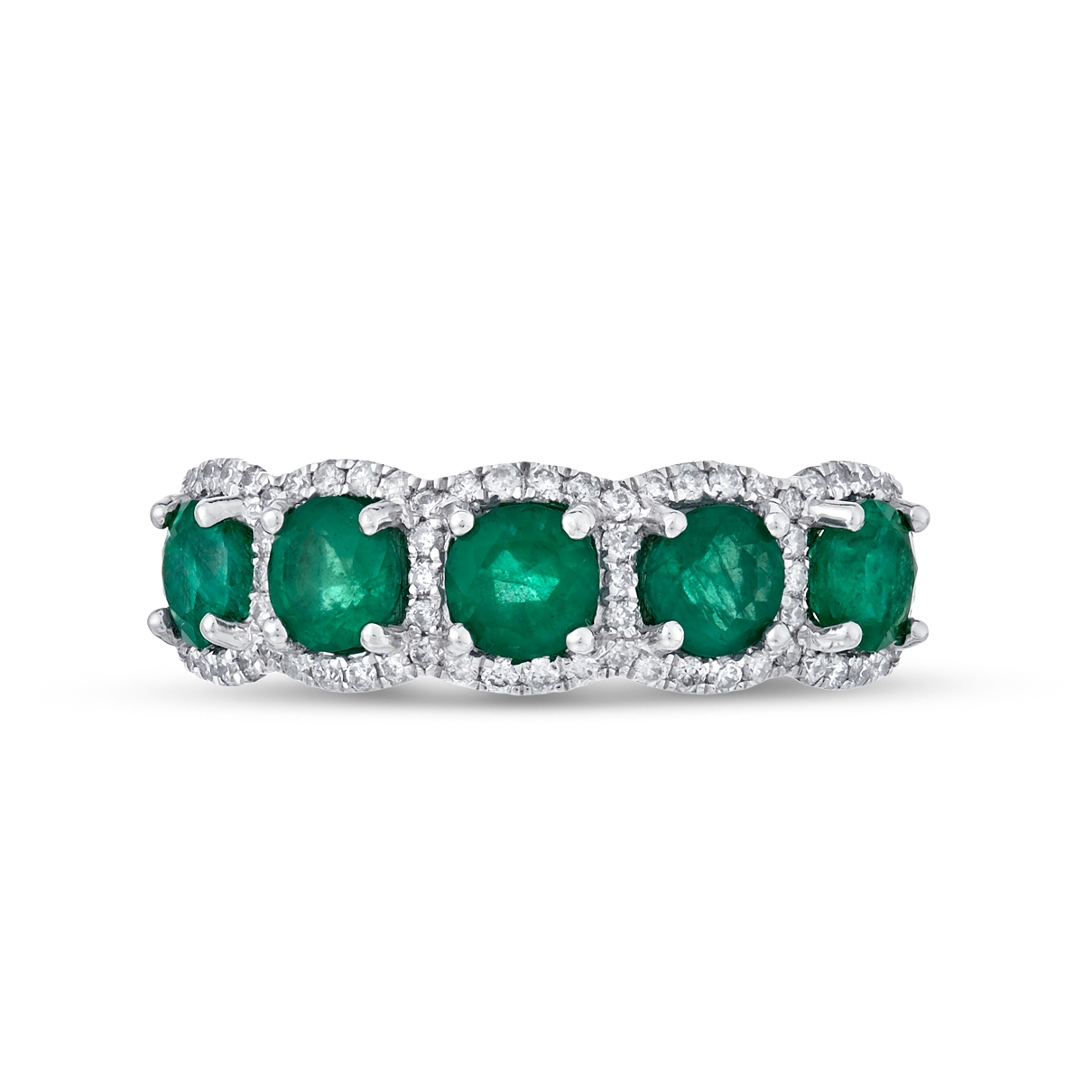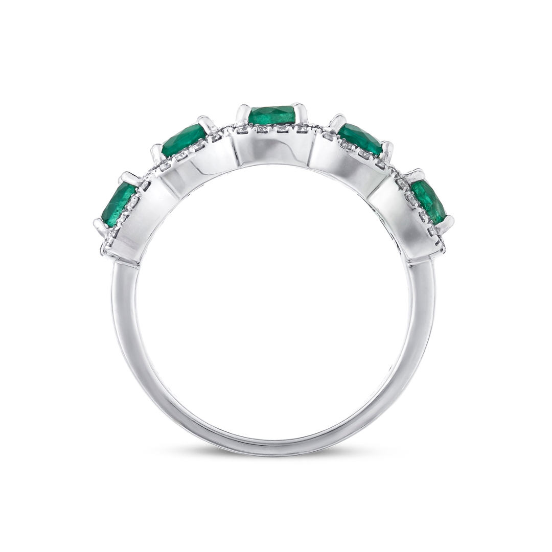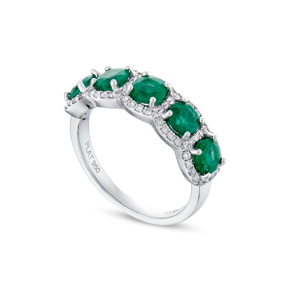 A brand-new, unused, certified natural diamond & emerald cluster ring, with five round mixed-cut emerald gemstones at the centre & a cluster of brilliant-cut diamonds in a halo setting, set in platinum.