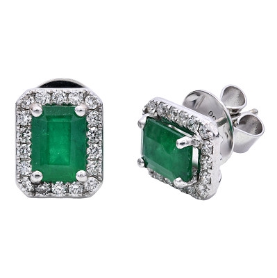 Encircling the emeralds is a halo of brilliant-cut diamonds totalling 0.43 carats, selected to enhance light performance without overpowering the gemstones. The stones are set in 18ct white gold, a classic choice that complements both diamond brilliance and emerald depth, while offering durability and enduring appeal.