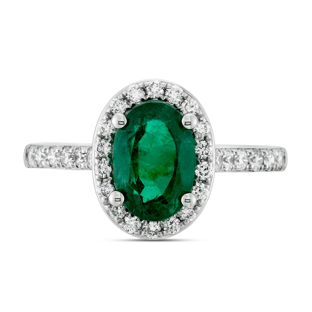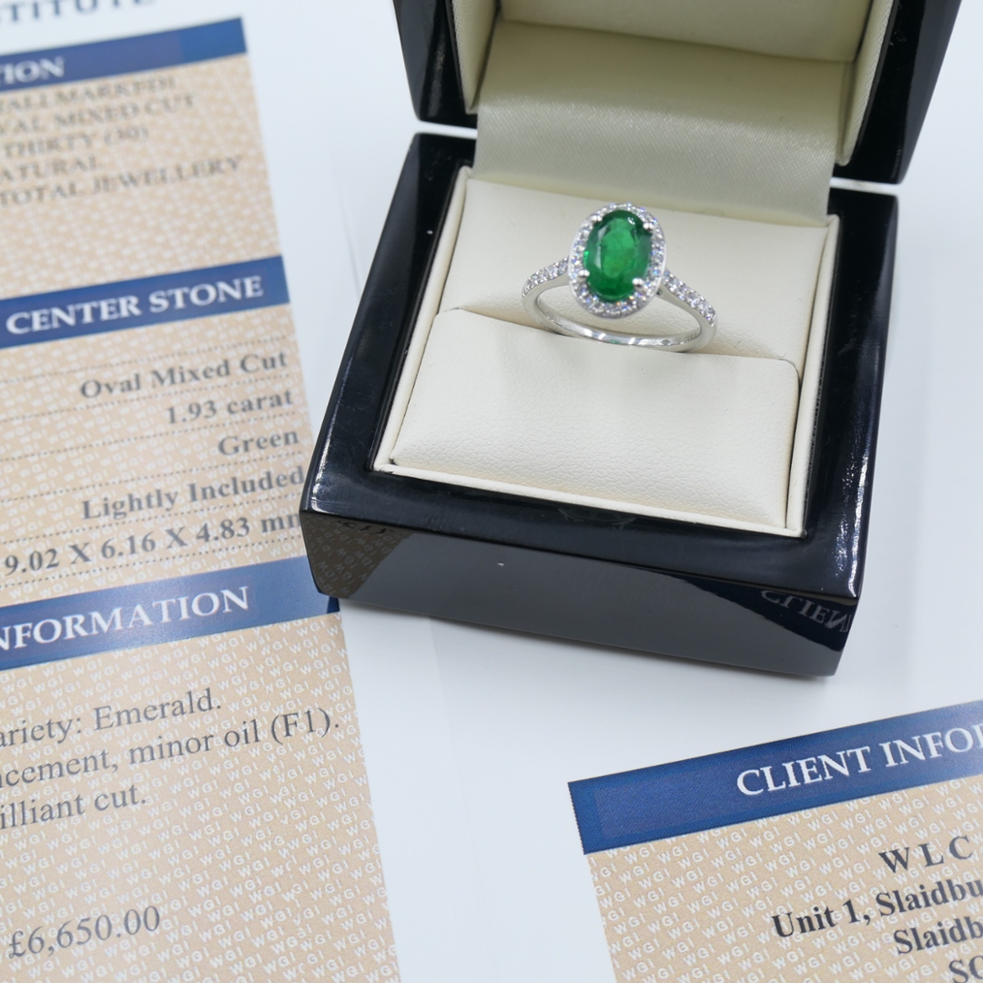 A brand-new, unused ring showcasing a magnificent 3.52-carat natural emerald, certified by the World Gemological Institute. This exceptional gemstone displays an intense, vividly saturated green hue that captures the light beautifully, revealing its depth and natural radiance with every glance. Its remarkable colour and clarity reflect the very essence of luxury, while the precision of its oval cut enhances its brilliance and allure. Surrounding the emerald is a halo of round brilliant-cut diamonds totalling 0.48 carats, each one meticulously set to amplify the gemstone’s striking presence.