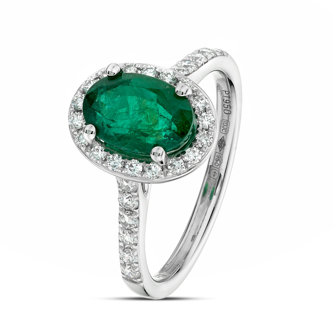 A brand-new, unused, certified natural diamond & emerald oval-shaped cluster ring, with one oval mixed-cut emerald gemstone to the centre & a cluster of brilliant-cut diamonds in a halo setting & to the shoulders, set in platinum.