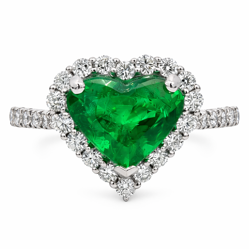 A brand-new, unused certified natural diamond and emerald heart-shaped cluster ring, set with a captivating 2.36ct heart-cut emerald at its centre, surrounded by a radiant halo of brilliant-cut diamonds with further diamonds extending along the shoulders, all expertly crafted in platinum. The romantic heart-shaped emerald creates a bold, distinctive focal point, while the surrounding diamonds enhance its rich green hue and natural character, resulting in a piece with both elegance and strong visual impact.